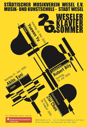 2026 erleben wir nun schon zum 26. Mal den Weseler Klaviersommer. Wie in jedem Jahr werden es auch in diesem Jahr 4 festliche, virtuose Klavierkonzerte, die in den Monaten Mai, Juni, Juli und im August in Wesel stattfinden: Veranstalter und Organisator sind der Städtische Musikverein Wesel e.V., sowie die Musik- und Kunstschule der Stadt Wesel, in deren Aula diese Konzerte dann jeweils an einem Sonntag um 18 Uhr zu hören sein werden. Mitgetragen und unterstützt werden die Veranstaltungen von der Pianofirma Shigeru-Kawai aus Japan, die die aufstrebenden jungen Virtuosen vermittelt und unsere Konzertreihe großzügig unterstützt.