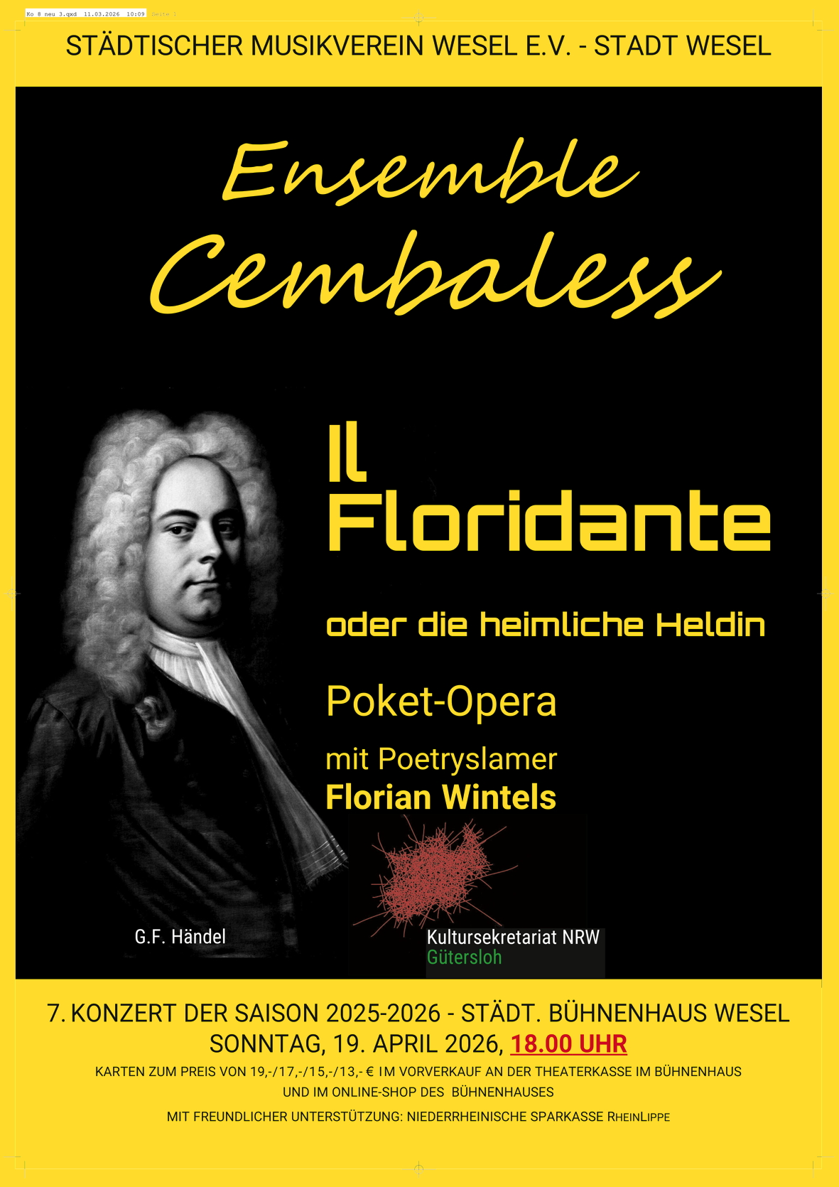 Am Sonntag den 19.April 2026 um 18 Uhr ist das Ensemble Cembaless mit Elisabeth von Stritzky (Sopran) & Florian Wintels (Poetry Slam) zu Gast im Städtischen Bühnenhaus Wesel. Auf dem Programm steht G. F. Händels Oper: „Il Floridante oder Die heimliche Heldin“ – eine barocke Oper aus dem Jahr 1721 – aber in einem modernen und neuen, kreativen Arrangement für eine(!) Sängerin (Elisabeth von Stritzky), einen Poetry Slammer (Florian Wintels) sowie das sechsköpfige Kammerensemble von Cembaless: Frisch! Kreativ! Farbenreich!